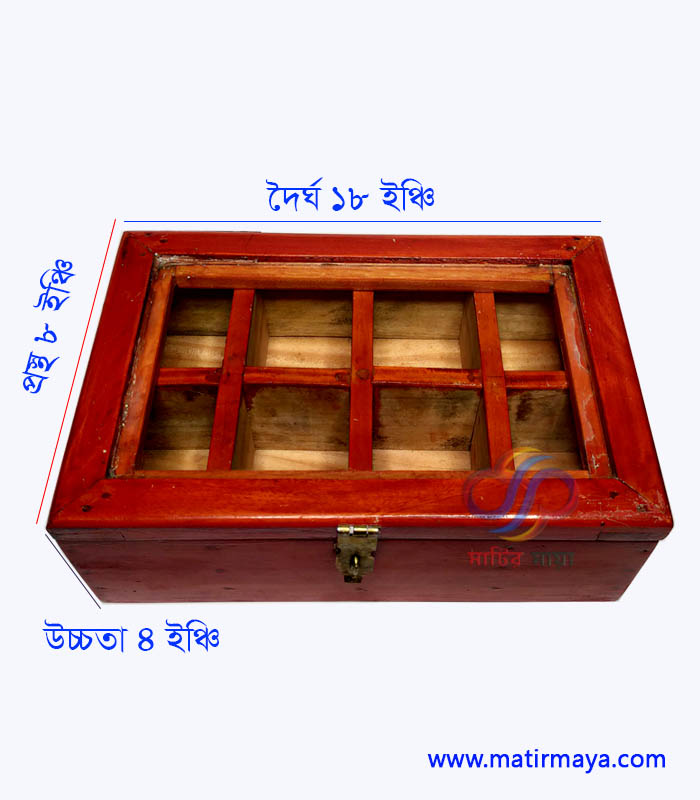• সাইজঃ  দৈর্ঘ ১২ ইঞ্চি, প্রস্ত ৮ ইঞ্চি ও উচ্চতা ৪ ইঞ্চি । এর মধ্যে ৮ টি বক্স আছে, প্রত্যেকটা বক্সের দৈর্ঘ ৪ ইঞ্চি প্রস্ত ৩ ইঞ্চি উচ্চতা ৩ ইঞ্চি।